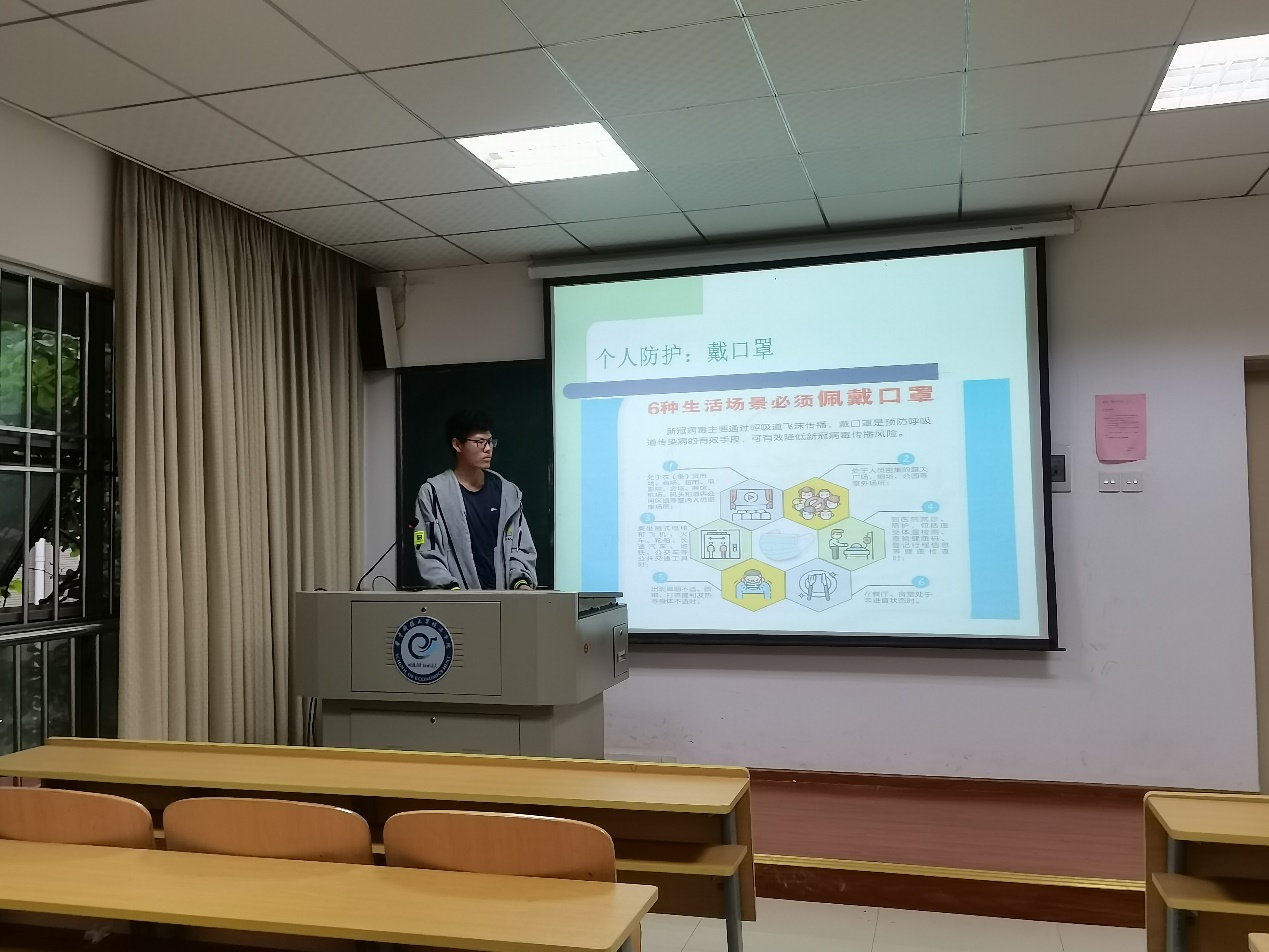 本次班会开始,杨宏大同学先简要介绍了目前的疫情防控形势。在依然严峻的疫情形势下,他号召同学们出门戴口罩,勤洗手,尽量避免出校活动。如有必要出校,遵循“两点一线”原则,减少可能存在的密接发生。同时,他向大家讲解了一些恰当的防护措施,同学们均认真进行了学习。