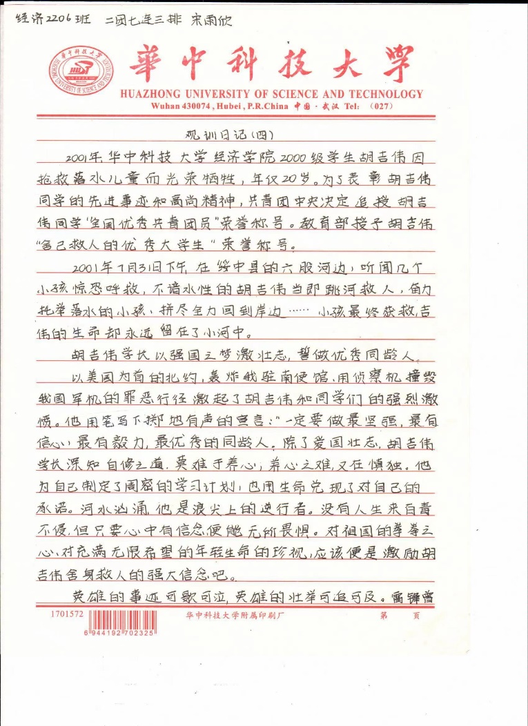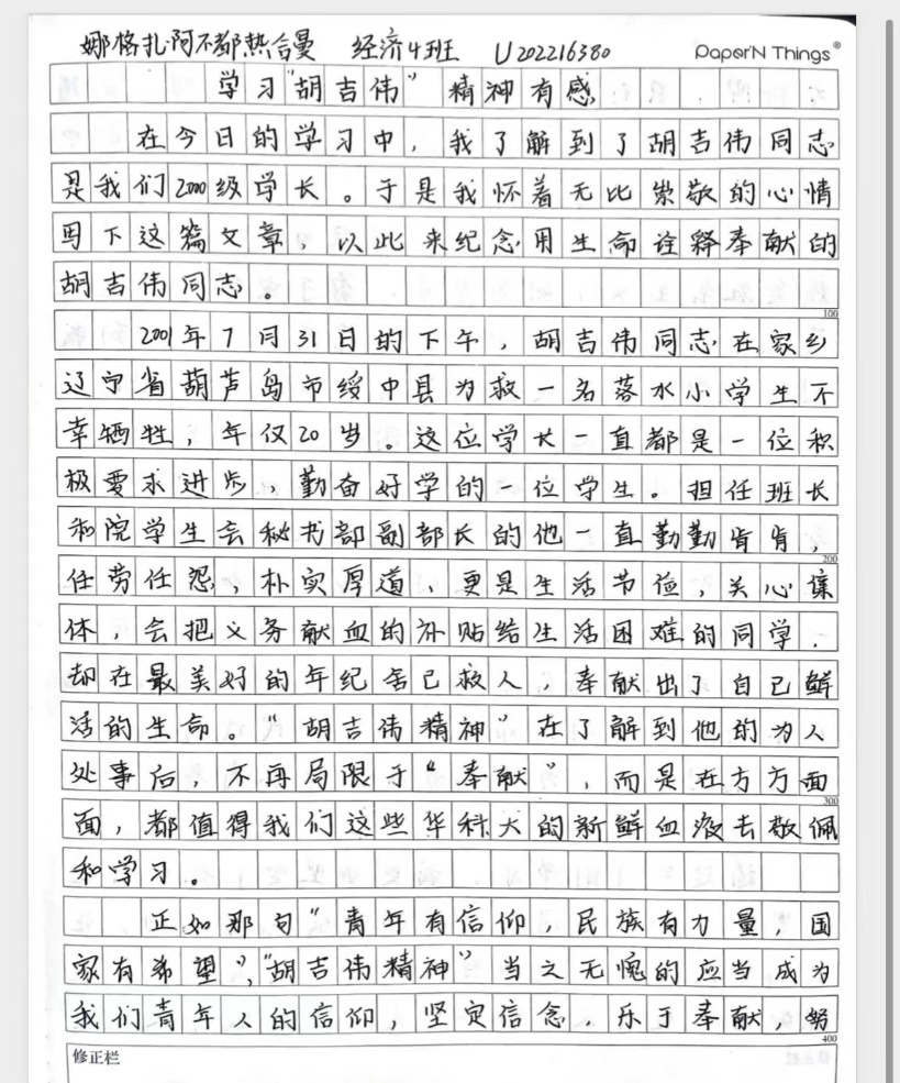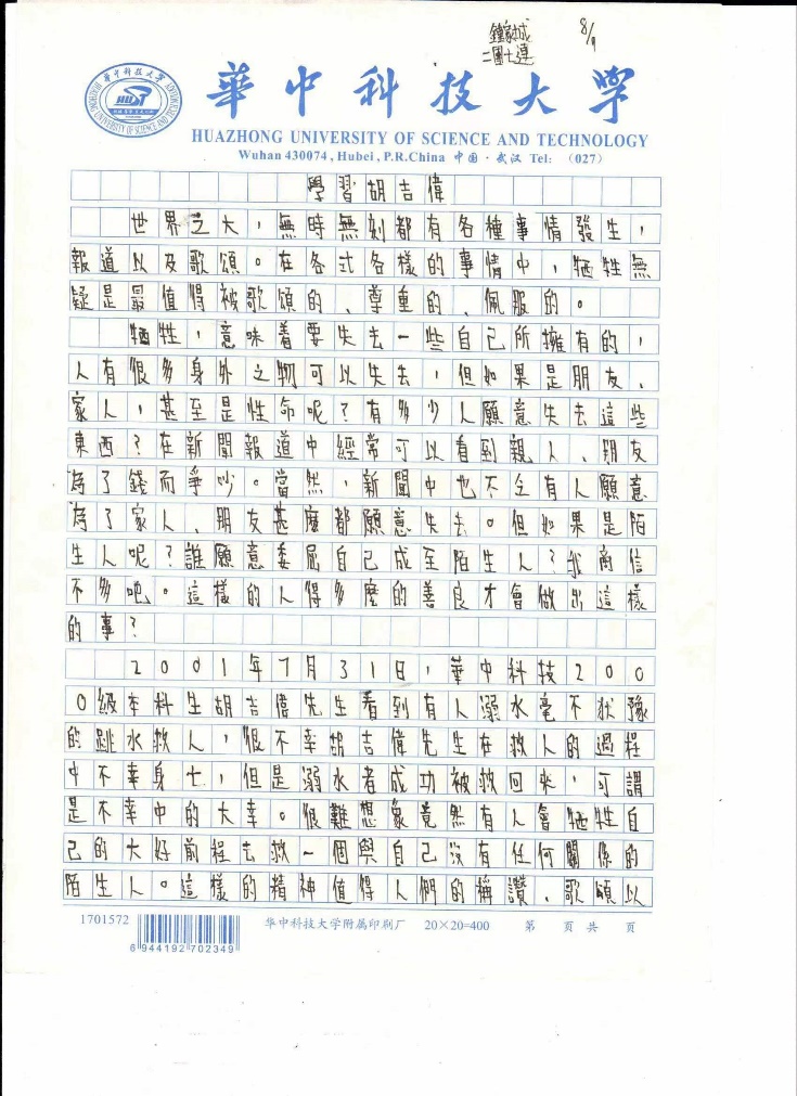 胡吉伟,一个名字,一种班级,一类精神,一座丰碑,感召了无数华科人不计小我,成就大我,激励我们多行善事,不做恶行。我们学习胡吉伟精神,绝不是轰轰烈烈的兴趣使然,更应是春雨润物无声的持之以恒。