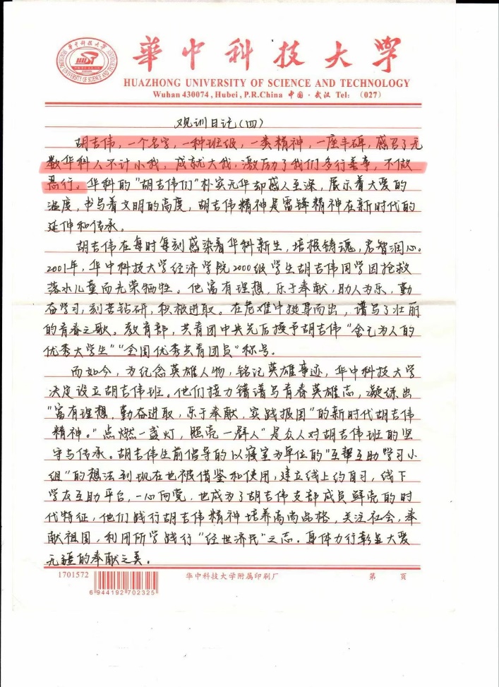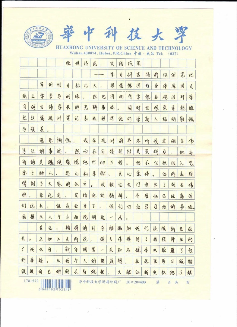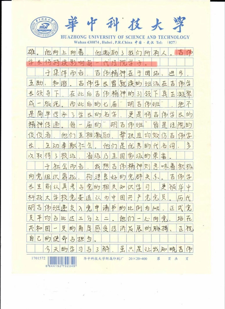 人人都应争做新时代的胡吉伟,将胡吉伟精神与当今的时代条件相结合,让胡吉伟精神不断与时俱进,伴随华中大人一起传播到祖国的各个角落。