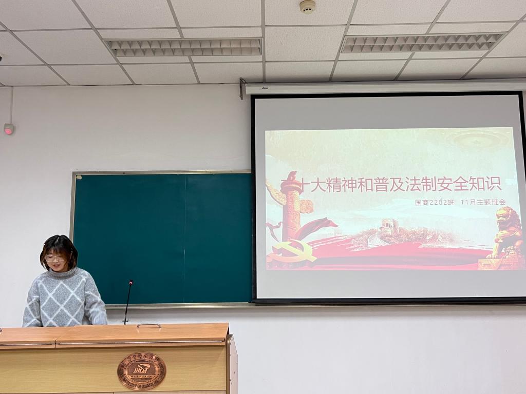 2022年11月24日晚上七点,惠风和畅,在党的二十大胜利闭幕之后,为进一步深刻学习落实习近平新时代中国特色社会主义思想,落实《高举中国特色社会主义伟大旗帜 为全面建设社会主义现代化国家而团结奋斗》习近平总书记重要讲话精神,引导班级成员深刻认识“坚持全面依法治国 推进法治中国建设 ”的重要意义,2022级国际商务二班在东九教学楼D314教室以“二十大精神和普及法制安全知识”为主题召开了主题班会,班级进一步深刻学习了党的二十大精神,进一步激发了同学们学习党的二十大的热情,形成了良好班级氛围。国际商务二班全体成员参与本次班会,班长宋梦瑶主持本次班会。