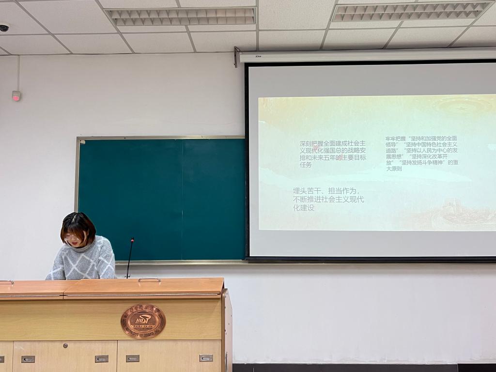 在本次班会上,宋梦瑶班长首先阐释了本次班会目的,是要深刻领会过去5年的工作和新时代10年的伟大变革,深刻领会开辟马克思主义中国化时代化新境界,深刻领会新时代新征程中国共产党的使命任务,深刻领会中国式现代化的中国特色和本质要求,深刻领会社会主义经济建设、政治建设、文化建设、社会建设、生态文明建设等方面的重大部署,深刻领会教育科技人才、法治建设、国家安全等方面的重大部署,深刻领会国防和军队建设、港澳台工作、外交工作等方面的重大部署,深刻领会坚持党的全面领导和全面从严治党的重大部署。