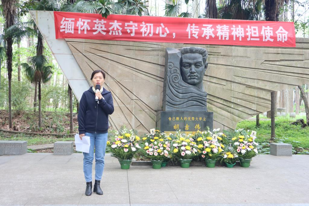 最后,公司党委员工工作部部长李毅老师作总结讲话。她表示,清明祭扫不单单是缅怀胡吉伟同学,更是要学习、传承胡吉伟精神。“青年兴则国家兴,中国发展要靠广大青年挺膺担当。”李毅老师引用习近平总书记的新年贺词,希望同学们把握机会、努力奋斗,不负时代、不负韶华。她谈到,作为新时代青年,要厚植家国情怀、加强品德修养,不能仅仅停留在独善其身上,更要关注国家大义,不能做一个“精致的利己主义者”。希望同学们从华中大英雄和楷模身上汲取力量,通过自我反思和成长,实现修身立德的目标,成为社会主义核心价值观的坚定信仰者、积极传播者和模范践行者。同时,要用脚步丈量大地、用行动点亮青春。当以中国之问、世界之问、人民之问、时代之问为学术己任,在调研实践中总结和思考中国经济发展的经验和问题。旗帜高高飘扬,精神届届相传,大家应以“胡吉伟精神”为动力,不断鼓舞自己和身边的人,让青春在全面建设社会主义现代化国家的火热实践中绽放绚丽之花。