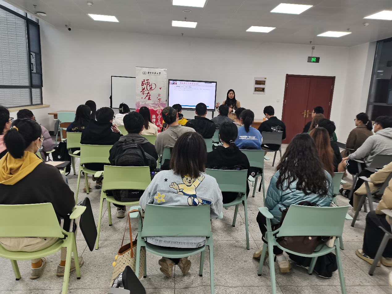 交流期间,叶巾祁老师从两大模块——如何进行科研论文写作和如何进行科研成果展示展开讲解。在科研论文写作方面,叶老师从科研项目、学术写作方面展开讲解,并给同学们分享了正确且清晰的写作顺序,然后按照写作顺序与同学们分享写作步骤对应的要点,为同学们提供了结构化的论文写作方法。在科研成果展示方面,叶老师提到,科研成果展示环节在同学们参与答辩、面试、研讨会中具有重要意义。为此,她为同学们提出相应的建议,让同学们在每一场科研成果展示中注重精神面貌并有较好的心理准备,踏实自信地进行每一步。