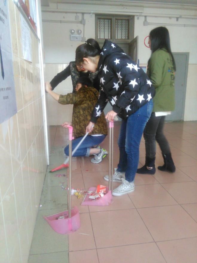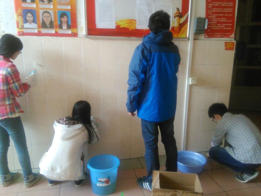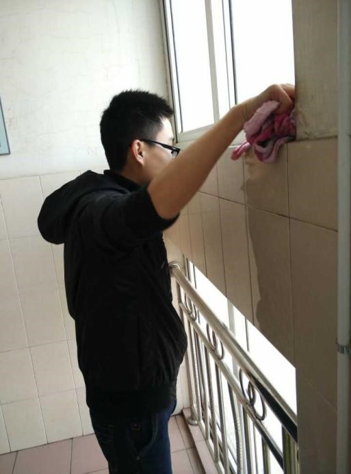活动是在早上9点开始的,先看24栋:女生们自带抹布、水桶、铲子和钢丝刷,分好小组,到各自楼层开始劳动。平时常有人进到宿舍楼中,挨个在宿舍门上、外墙上贴上小广告,大大小小,花花绿绿的,日子久了,十分碍眼,很难清除。同学们先用桶装上热水,再撒入适量洗衣粉,活匀后用抹布将小广告润湿,再用铲子和钢丝刷清除,剩下部分再用抹布用力擦去,费时费力,连着三张清除下来,手臂已经酸痛不已。最难清除的是楼梯口的宣传海报,不是纸的所以不能用抹布清除,只能用铲子一点一点的铲掉。在看8栋:男生们在阿姨的指挥下,到各楼层擦窗、擦墙壁,任务虽简单,但大家都很认真,不留一丝灰尘,擦完后果然窗明几净。之后男生们开始扫地、拖地,清除天花板上的蜘蛛网,同学们互相协作,一起努力了很久,终于在11点时完成了任务。