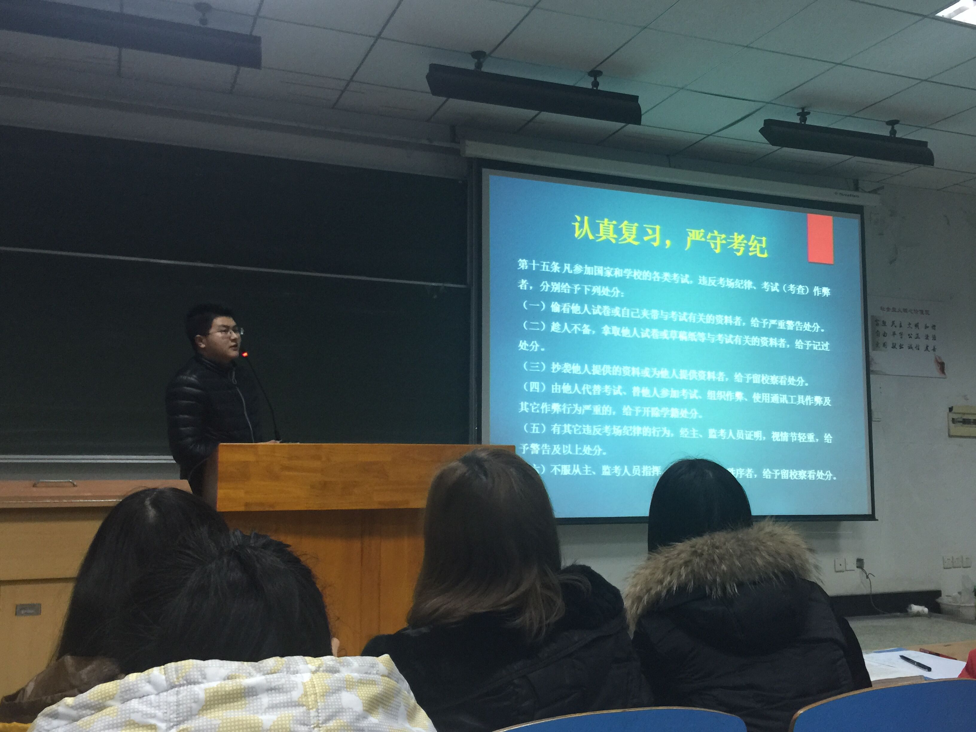 本网讯(通讯员 马康宁)2016年1月5日晚7点,在东十二教学楼F101教室召开了2015级第四次年级大会。2015级辅导员彭鹤翔及2015级各班研究生班主任出席大会,大会由彭鹤翔主持召开。