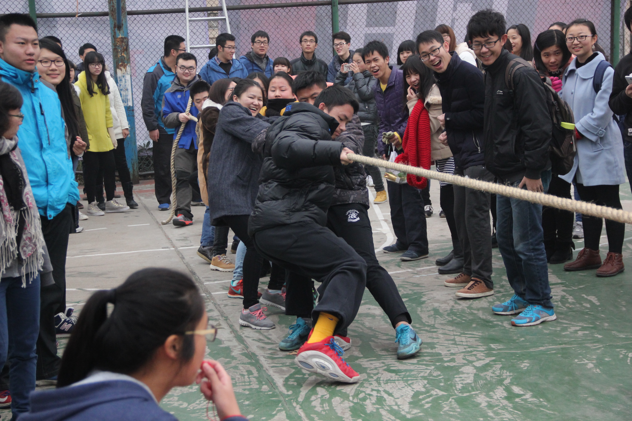 九点整比赛正式开始。各班以班级为单位,分别派出已选好的五名男生及五名女生混合参赛,通过抽签方式进行小组比赛,胜出一方则晋级进行下一轮比赛,直至最终产生前三名。赛前,队员们目光坚定,互相鼓励。随着哨声响起,队员们紧握长绳,喊着“一二,一二……”的口号向班级所在方向一致拼命拉绳,啦啦队们则在一旁呐喊助威,辅导员们也来到了现场,并在一旁跟着队员一起喊口号。虽已是冬季,篮球场上却充满青春活力。此时工作人员正在忙着为比赛做最后的准备,大家也斗志昂扬。一场激动人心的比赛即将打响。