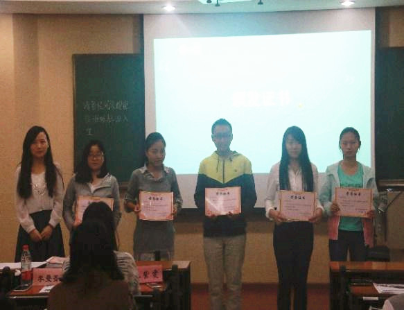 主持人朱媛媛宣布上一年度获得“部门之星”及“优秀资委”称号的名单之后,辅导员朱紫雯和李曼菁分别为他们颁发证书并合影留念。国际商务1401班班级资委赵丽同学作为优秀代表上台发言,与大家分享她的心得体会。