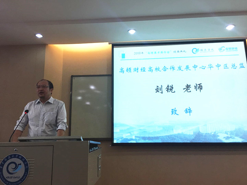 随后,刘锐老师上台致辞。他向荣获“高顿英才奖学金”的经院学子表示了祝贺,同时谈到,一个企业应该有它的社会责任感,高顿财经所做的,包括在各大高校设立奖学金等,不是由利益所驱动的,而是为了承担起那份社会责任。以后公司有任何活动需要经费支持,高顿财经公司也很乐于提供赞助支持。