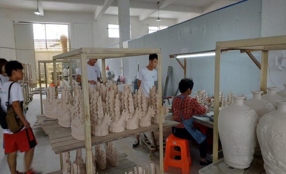 景德镇的第二站是罗家桥乡,罗家桥乡的乡长热情的向队员们介绍了目前罗家桥乡政府的发展情况,不仅仅是陶瓷产业园区的发展规划,还向队员们介绍了罗家桥乡近两年蔬菜,粮食作物等其他农业经济作物的发展和农民生活水平的改善。在介绍完后,他还特别联络了工业园区的相关负责人,让带着队员们一行人参观陶瓷的制作流程,进一步详细介绍陶瓷企业的孵化,运作。在参观陶瓷制作流程的过程中,队员们注意到,陶瓷产里边每种样式的陶瓷都会有好几个架子,这样的话在陶瓷制作过程中保证了产量,但与此同时,也缺乏了陶瓷的新意,失去了创意性。