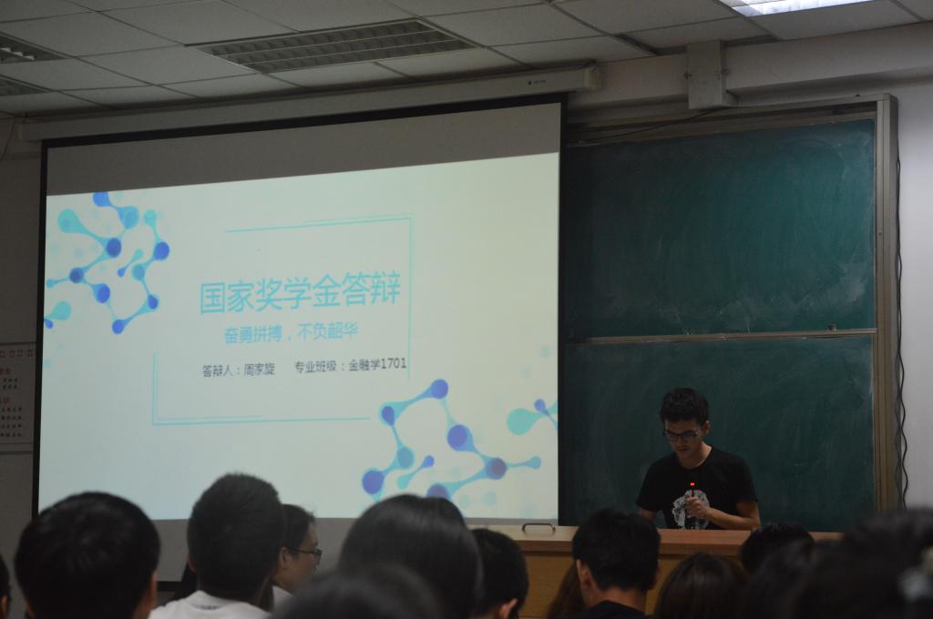 六位国奖候选人先后展示了自己在大一学年的学习、工作以及其他方面所取得的丰硕成果。周家旋同学以93.97的学年加权总成绩位于金融专业第一,连续两学期数学分析满分的成绩离不开他精确到分钟的学习生活时间规划;余鑫哲同学讲述了自己在优异的学习成绩的之外勤于思考和实践,暑期参加了波兰AIESEC国际志愿活动;戴子健同学展现了一个在学习成绩和体育锻炼中不断优秀不断变强的自己,并强调暑期社会实践活动的收获和成长;花梦颖同学在思想上积极追求进步,在学习上孜孜以求,不断给自己充电;刘子恒同学坦言学习对他来说没什么挑战性,反而是作为班级的班长,一年的员工工作带给了自己很多的成长和蜕变;龚欣睿同学称自己是自习室里的“钉子户”,在员工组织SICA的活动中不断锻炼提高了自己的英语能力。经过现场投票和公开计票,周家旋、余鑫哲、刘子恒和龚欣睿同学获得了本次国家奖学金的荣誉。