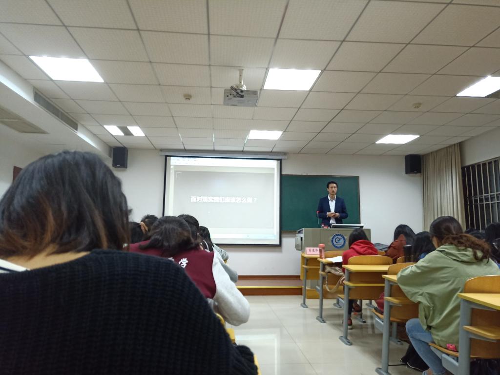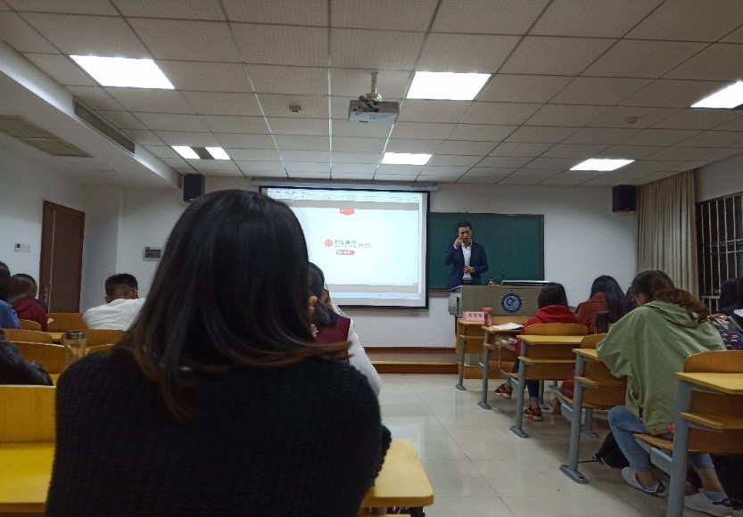 主讲嘉宾肖经理以其在银行丰富的工作经验,以专业的角度为同学们介绍了校园贷的基本信息和现存校园贷的种类。进而为同学们讲解了非法校园贷的形式、种类、特点以及危害。讲解过程中,肖经理以现实生活中的案例向同学们展示了“非法校园贷的魔窟”,同时给同学们提出了几点规避非法校园贷的建议:要养成合理的消费习惯,不盲目攀比。讲座尾声,肖经理给同学们分享了一些职场里的经验,提出了一些关于工作、公司、行业等就业方面的建议,并与同学们进行了有趣的互动。