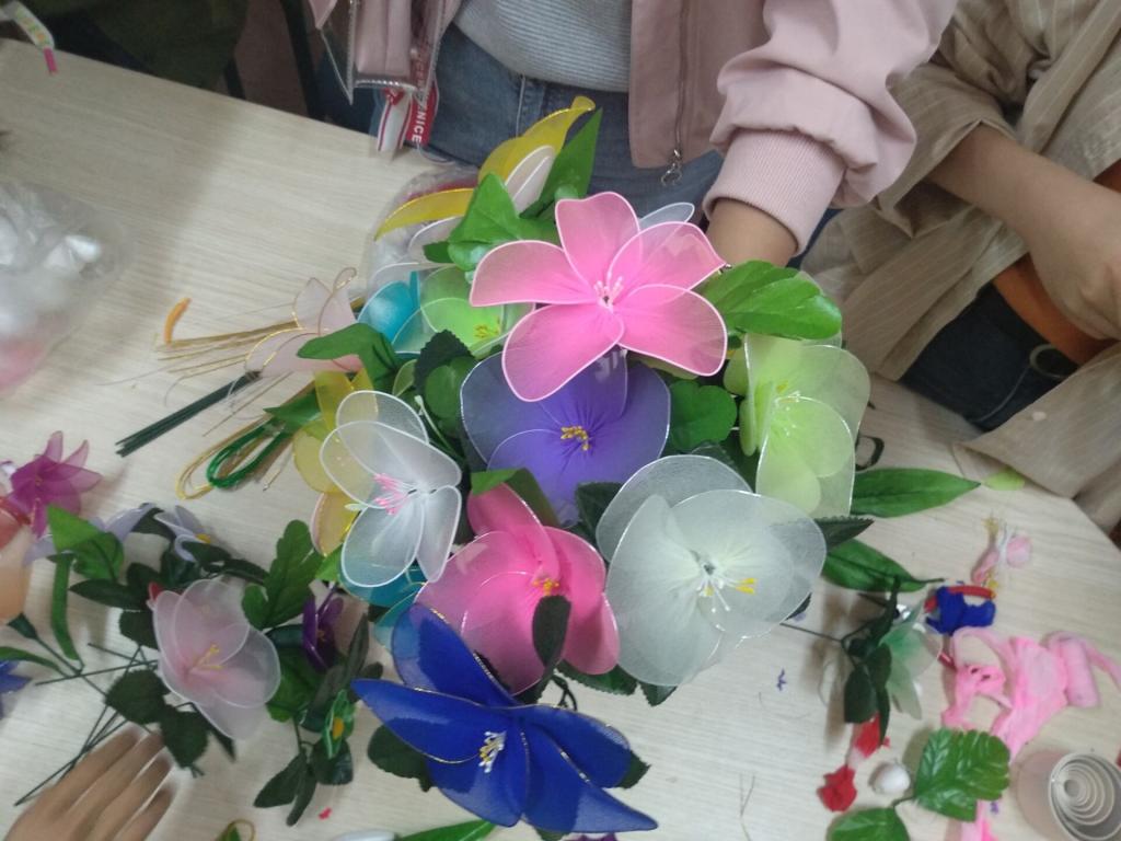 经历了一次的失败后,义工们开始奇思妙想,增加或减少花瓣数量,变换花和叶的形态,搭配不同的花色,创造出五颜六色的丝网花,有的若玫瑰,有的似郁金香,有的像牵牛,还有那不知名的绿野花。志愿者们对自己的作品纷纷表示满意,露出欣慰的笑脸。