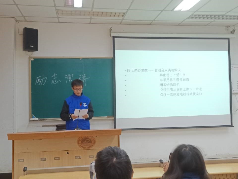 首先上台的是欧文涛同学,他从各角度多层面深入讲述了努力学习的重要意义,结合实际讲述了只有努力学习才能掌握主动权,从而在日后的道路上更占先机的道理。张戎文同学结合当下热点“特朗普失众议院”一事阐述自己从中感悟到的人生道理:不要过于依赖他人的帮衬,唯有自己的实力才最可靠。李万森同学用诙谐的语调,搭以PPT生动地展现了“电车难题”这一深奥的哲学问题,并深入浅出地表达了自己的看法与见解。