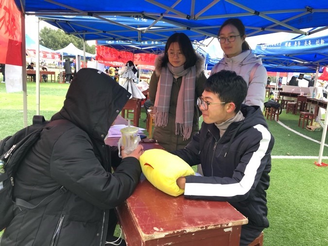 上午10点,戴曼菲、金羽飞、张凤娟三位同学换班,继续接待参与游戏的同学。有两位女生进行了“你划我猜”的游戏。她们配合默契,一气呵成,在两分钟内通过了十道题。心援队部员们以热烈掌声为她们庆祝。