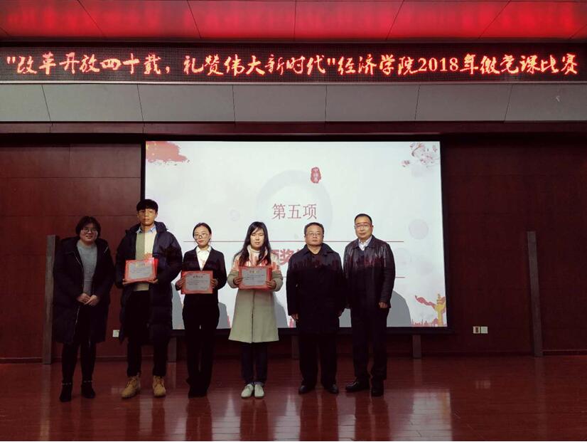 经过各位评委的认真打分,最后评选出此次比赛的获奖选手:硕士18级第四党支部代表王艺获得一等奖,本科国贸党支部代表刘婧姝获得二等奖,硕士18级第二党支部代表程卓俊获得三等奖,江洪洋书记、崔金涛书记和赵广燕老师分别为他们颁发了奖状和奖品。最后,全体参会人员合影留念,至此,本次“改革开放四十载,礼赞伟大新时代”主题微党课评选比赛圆满结束。