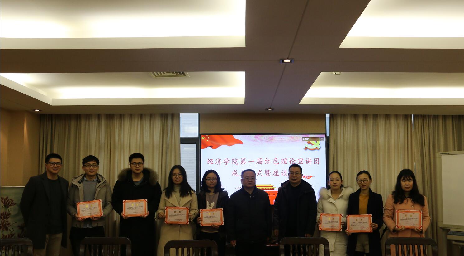 宣讲团由理论基础较为牢固、理论宣讲经验较为丰富的6名的本科生和3名研究生组成。首先,彭鹤翔老师宣布第一届红色理论宣讲团的正式成立,江洪洋老师和崔金涛老师向成员颁发聘书。