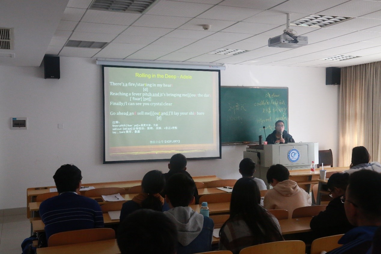 利用课间时间刘要武老师向同学们介绍了英文歌中出现的一些特殊现象,同时带着同学们演唱这些歌曲,课间氛围轻松愉悦,同学们掌握了利用碎片化时间学习英语的方法。