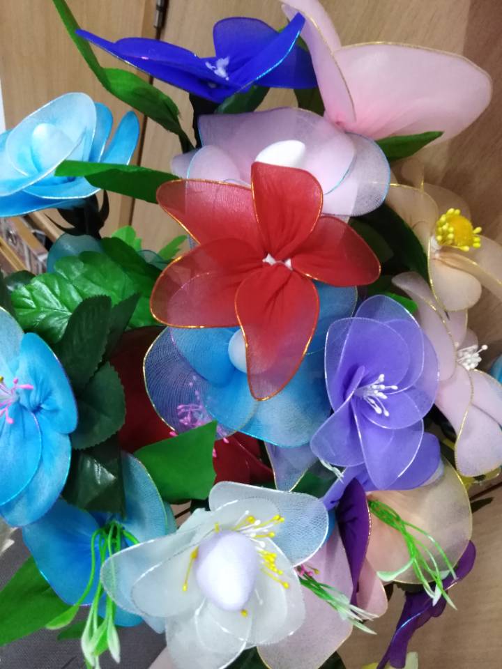 第一次的尝试让志愿者们明白了编丝网花是个细致活。志愿者们总结教训,重新出发。他们增加或减少花瓣数量,调整花瓣的大小,搭配花蕊和花苞,让花多了一份生机。这一次,志愿者们做出了形状和颜色更加丰富的花朵。