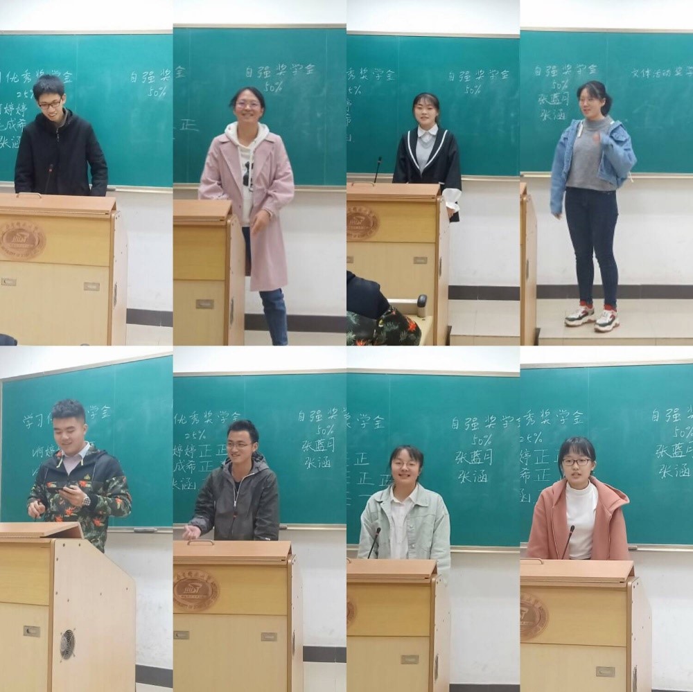 第二项内容是奖学金的评定。同学们积极申报了各项奖学金,在一轮轮激烈的拉票和答辩之后,八名同学脱颖而出。