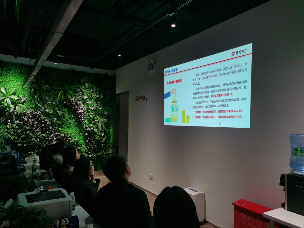 在大家对招行3.0网点的智能设备与服务理念都有了直观的体验后,工作人员也非常贴心地为大家安排了一场关于校园贷和老员工生活金融风险的讲课。主讲人员讲解了一些近年来典型的校园贷诈骗案例,剖析了非法校园贷猖獗的原因,重点强调了其低利率宣传、多重收费的套路,同时,介绍了个人信用报告的含义及查询方法,帮助同学们在日常生活中避免可能产生不良记录的行为。