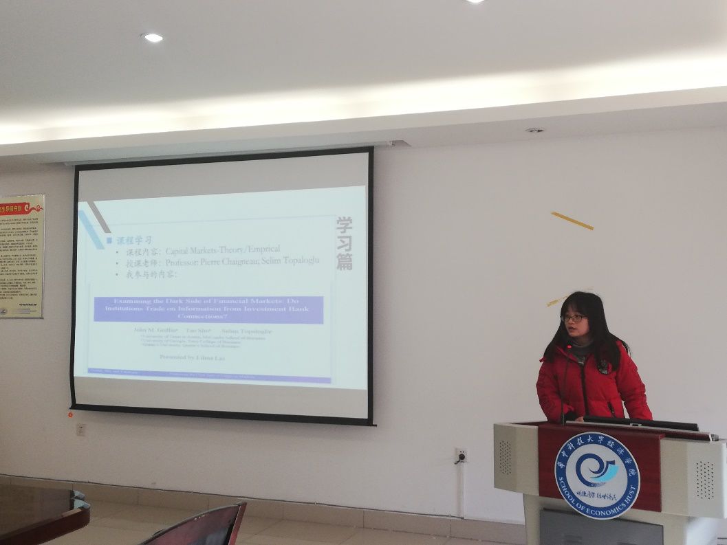 刘丽华学姐分享了自己的工作论文《Perk Consumption in Hard Times》。该文主要是通过中国国有企业集团的数据,研究强制分红政策对高管在职消费的影响。文章将2007年开始实施的国有独资企业上交国有资本收益作为"准自然实验",利用双重差分法识别了上交国有资本收益与集团内上市公司高管在职消费之间的因果关系。结果表明强制分红显著降低了高管在职消费,且机制检验结果支持了代理理论,异质性检验结果表明强制分红对高管在职消费的影响主要存在于治理环境较好的公司中。随后,刘丽华学姐分享了自己在加留学的生活以及疫情期间的心得,建议大家要一直保持积极乐观的心态和不断进取的态度;在国外要与同学互帮互助,团结友爱;合适的场合下可以积极向别人介绍中国。