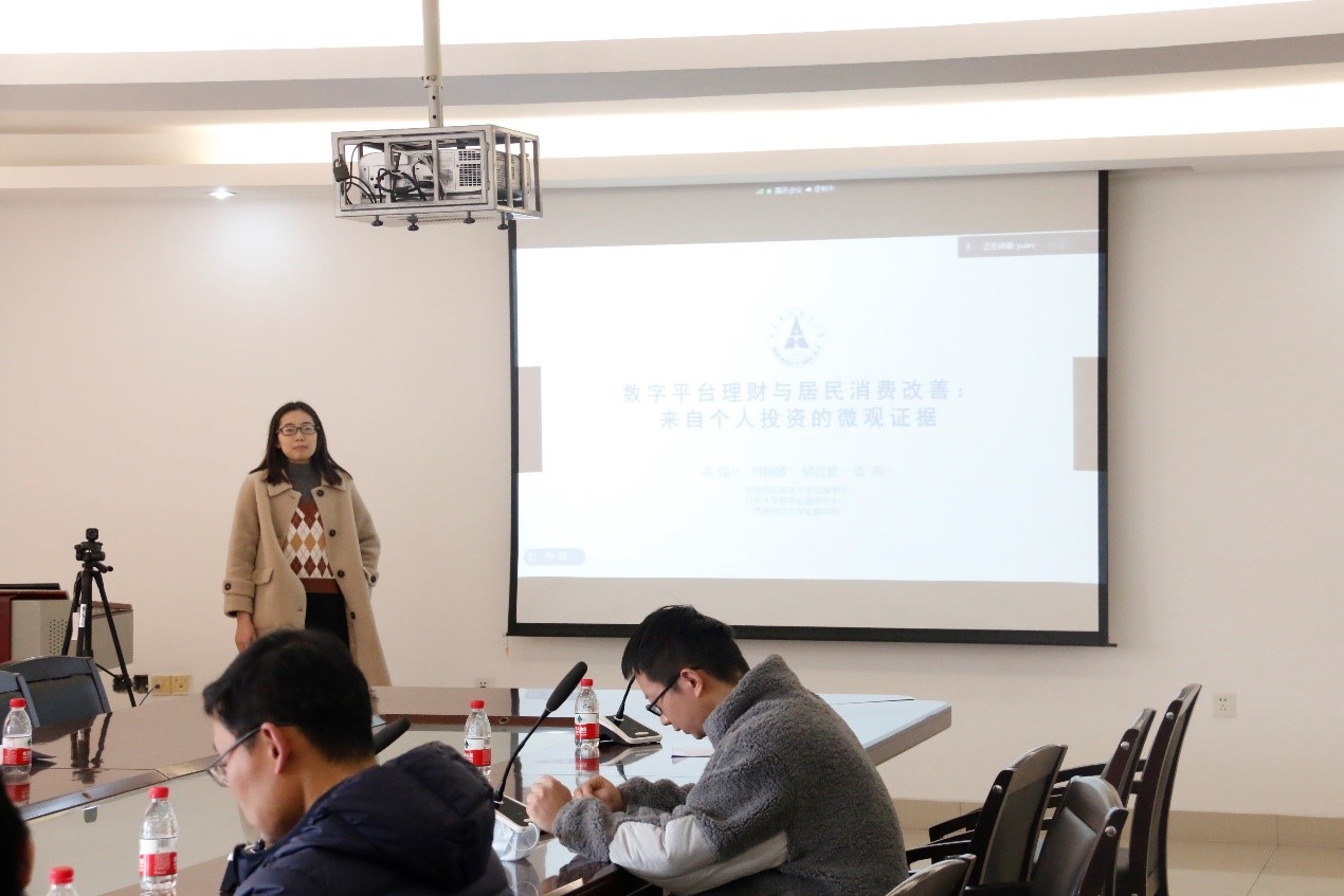第二位报告人是来自中南财经政法大学文澜公司的班铭媛博士,她参与会议的论文题目是《数字平台理财与居民消费改善:来自个人投资的微观证据》。首先,班铭媛以图文结合的方式对自己的研究动机进行了讲述,选择数字理财平台作为研究对象,很大程度上由于其具有便捷性、低费率并且有丰富的投资教育资源,一定程度上降低了理财门槛,但是数字理财平台对居民福祉改进作用却有待研究,因为一方面,它拓宽了居民理财渠道,增加了更多财富增值机会,另一方面,它更容易使居民陷入追涨杀跌、频繁操作等投资误区。因此,她希望通过研究来发现,居民通过数字平台理财是否会带来福利改进?从消费看,如果数字平台理财能够带来居民消费改善,哪一类居民从中受益更多?因此她聚焦于财富管理这一细分金融业务领域,融合了个体消费和基金理财数据,希望为检验数字金融普惠性提供更加具体、直接、微观的经验证据。