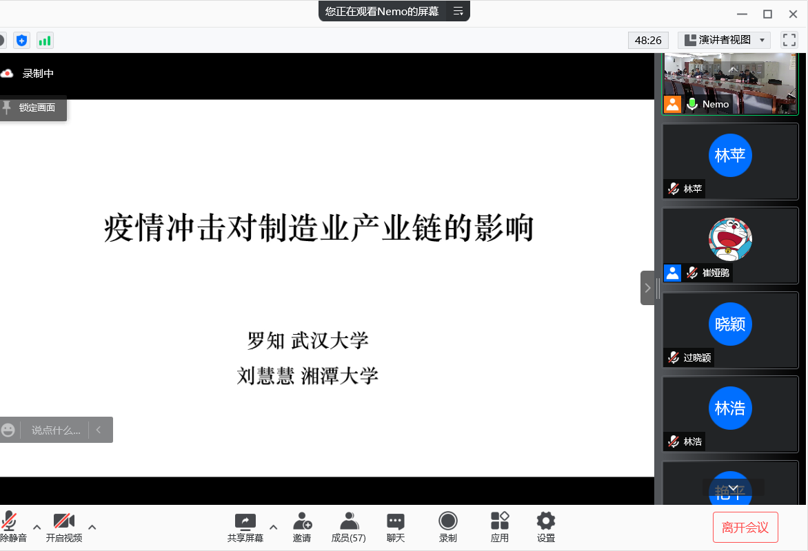 第二位报告人的是来自武汉大学经济管理公司的罗知老师,她参与汇报的论文题目为《疫情冲击对制造业产业链的影响》。