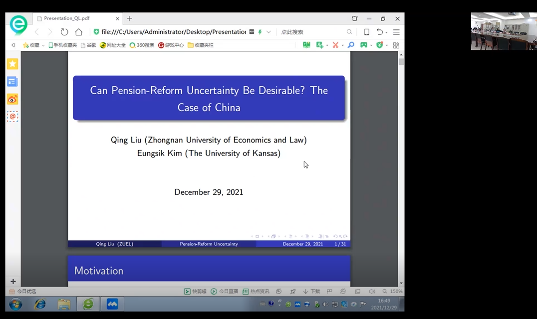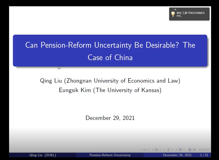 第五位报告人是中南财经政法大学财政税务公司刘庆老师,题目为《Can pension-reform uncertainty be desirable? The case of China》。