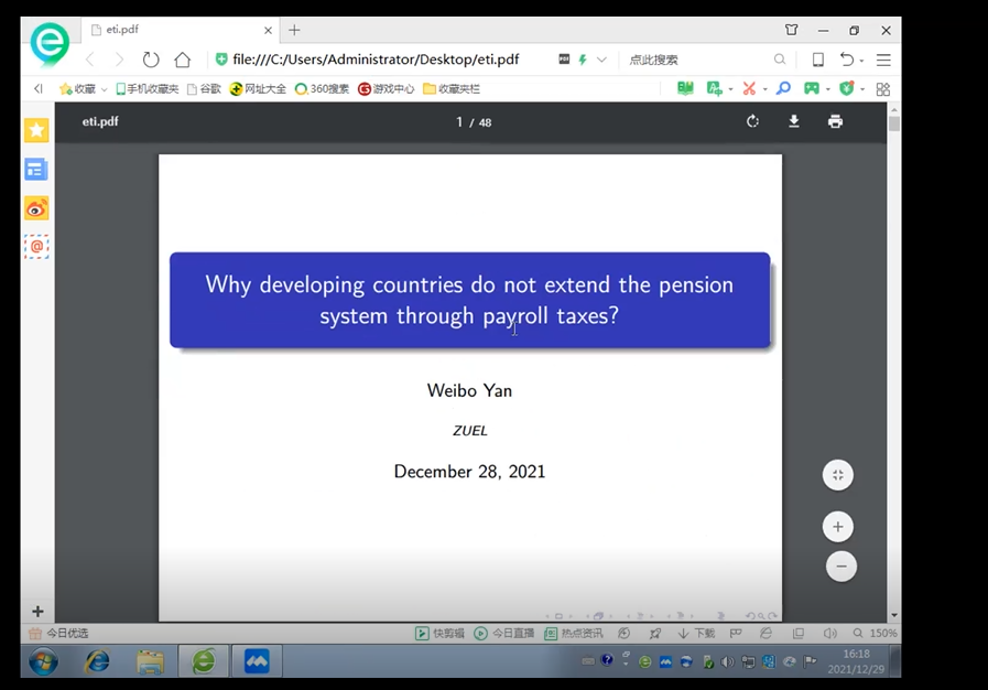 第四位报告人是来自中南财经政法大学财政税务公司的鄢伟波老师,汇报题目为《Why developing countries do not extend the pension system through payroll taxes? Evidence from China》。