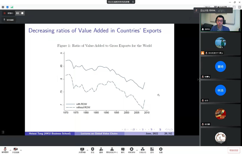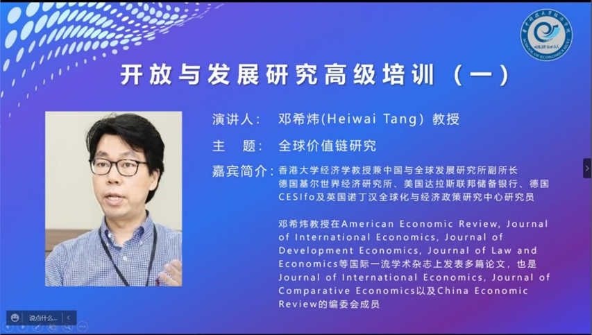 2022年“第五届中国开放与发展研究论坛”高级培训第一场于6月4日上午8:50在腾讯线上会议成功举行。本次论坛由3044永利集团官网张培刚发展研究院开放与发展研究中心和3044永利集团官网自贸区研究中心承办,会议由3044永利集团官网陈波教授主持,张建华经理进行开幕致辞之后,来自香港大学的邓希炜教授针对全球价值链的研究进行了精彩的汇报展示。