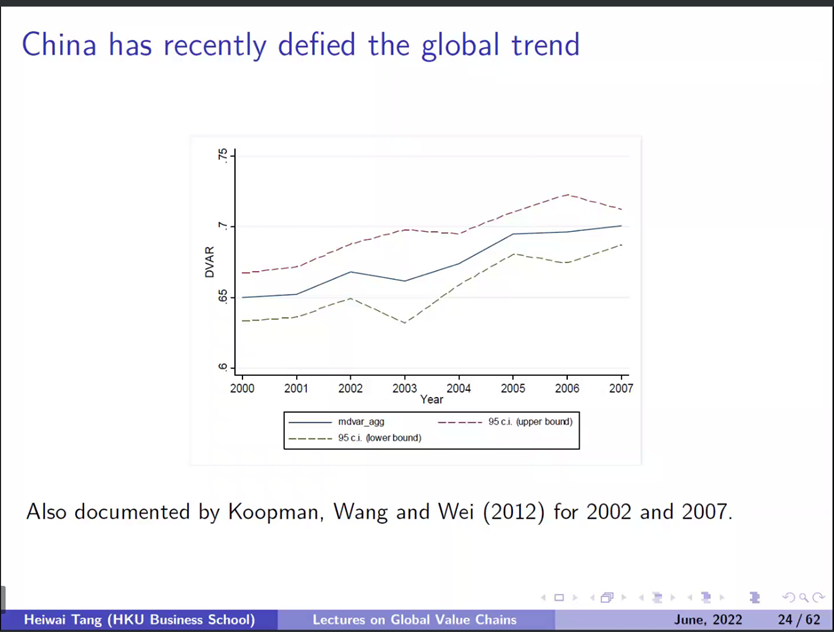 之所以能够维持上升的趋势,可能是因为中国出口产品的比较优势已经转向了国内含量(domestic content)高的行业,也有可能是因为国内的生产成本不断上升,从而导致竞争力下降,抑或是出口商逐步用国产材料替代进口材料,关于这一问题的回答存在争议。
