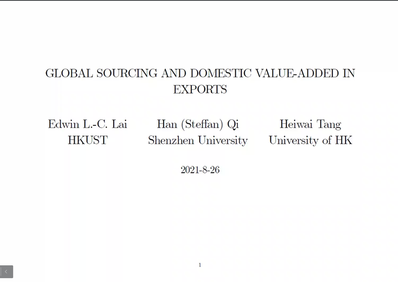最后,邓希炜教授分享了他的另一篇文章《GLOBAL SOURING AND DOMESTIC VALUE-ADDED IN EXPORTS》的主要成果。