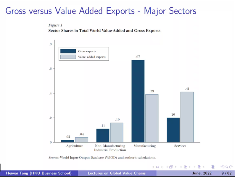 接着邓希炜教授展示了主要生产部门的总出口与增值性出口之间的关系,对于服务业而言,由于有许多服务是不可贸易的,所以会出现总出口小于增值性出口的情况:
