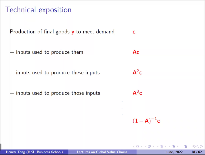 因此,贸易的总额应当被分解为多个部门和国家的增加值,当一种商品从一个国家出口时,该商品的价值由该国本身以及许多其他国家的增加值组成,比如一部iPhone手机从中国出口到了美国,大约有20%的劳动力和零部件来自中国,超过20%来自韩国,那应该将iPhone视为中国的出口产品还是韩国的出口产品呢?答案为:都不是。那么我们如何分解价值并将其不同部分归属于不同的国家呢?在这里以德国的汽车生产稍做分析:用以满足需求的最终产品y的成本为c,加上原材料的进口份额矩阵A乘以c,再加上生产原材料的投入A2c,以此类推: