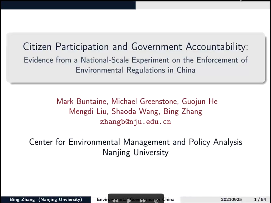 张炳教授的报告主题是《Citizen Participation and Government Accountability: National-Scale Experimental Evidence from Pollution Appeals in China》。这是一篇具体的学术研究,是关于公众参与和政府问责的实验性研究。张教授从新闻、微博的各种举报事件切入,并提出,有正常的投诉渠道,我们为何还需要微博等公共媒体进行举报,媒体公开投诉更有效吗?公众参与是否有效?为解决上述问题,张炳教授团队进行了一个全国性的大规模实验,对可能存在违法的企业进行举报。从结果来看,公开举报比其他举报效果更好。同时,举报有外溢效应,其他未举报的问题也会受到政府的关注。张炳教授从政府,企业两个角度研究投诉是否可以对企业有所改进。利用CEMS进行研究,在线监测25000家企业,分为不干预,不公开渠道投诉和公开渠道投诉三组进行实验。其中,结果有低估和高估两种情况。将城市分为两类进行研究,进行DID识别。最后,张炳教授指出投诉可以降低企业污染超标率,投诉不会引起其他人也进行投诉,同时,投诉多的企业污染有所降低。被投诉企业较多的地方,政府会加强监管。
