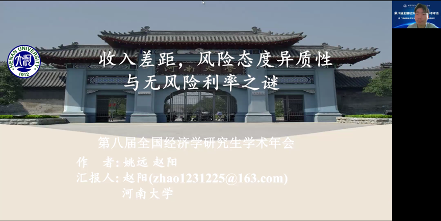 第二位作报告的是来自河南大学的赵阳,他带来了题为《收入差距,风险态度异质性与无风险利率之谜》的论文汇报。本文对C-CAPM中的一个代表性消费者假设提出了质疑,提出单一消费者与现实不符可能是导致无风险利率之谜的原因。本文引入普通收入、中等收入和高收入三类代表性消费者来体现风险态度异质性,从消费者总体帕累托最优的角度出发,推导出新C-CAPM和新无风险利率方程,并与原C-CAPM和原无风险利率方程进行对比分析,最后利用中国的实际数据对新假设条件下的无风险利率方程进行检验,对无风险利率之谜重新进行了解释。结论表明,消费群体风险态度异质性假设下,新C-CAPM背后的决定因素变为普通收入、中等收入和高收入三类消费者的随机折现因子和资产回报率组成的协方差;无风险利率由普通收入者和中等收入者的组合耐心程度、中等收入者对经济增长的态度、中等收入者的预防性储蓄动机共同决定,高收入者对无风险资利率的影响不明显。因此,消费群体风险态度异质性可能是原C-CAPM的无风险利率无法解释现实的原因。在实际社会中随着中等收入者收入的增加,其对风险的态度愈发向高收入者靠拢,会导致其相对风险厌恶系数降低,中等收入者的相对风险厌恶系数设置为0.6可以较好地解释无风险利率之谜。