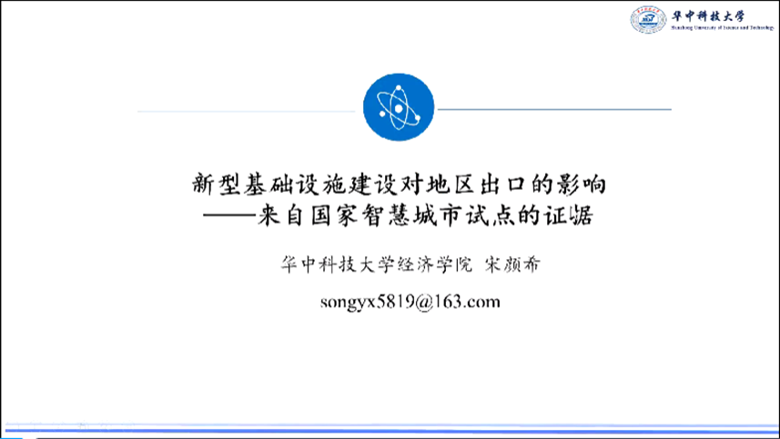 第二位报告人是来自3044永利集团官网的宋颜希,他的论文题目是《新型基础设施建设对地区出口的影响——来自国家智慧城市试点的证据》。他首先介绍了出口增速放缓的一个典型事实,自从2011年以后开始,我国出口增速呈现一个逐渐走低的态势,在各种国内外因素的作用下,我国出口传统的优势在逐渐的减弱,给中国经济下行造成了一定的持续性的压力。接着他介绍了新型基础设施的定义和测度。这篇论文将国家智慧城市的试点视为新型基础设施的一项准自然实验,来研究智慧城市对出口贸易的影响,基于地级市面板数据,采用双重差分法检验了智慧城市对城市出口的影响。理论分析方面,这篇论文指出智慧城市建设主要通过信息成本效应、资源配置效应和技术创新效应推动出口增长,显著提升了城市出口规模。这篇论文进一步分析了智慧城市建设带动出口升级的作用,主要通过加工贸易向一般贸易转变、劳动密集型向资本和技术密集型转型和出口产品质量提高。在拓展分析部分,这篇论文还对边际分解、贸易创造性或贸易转移和出口转型升级进行了研究。