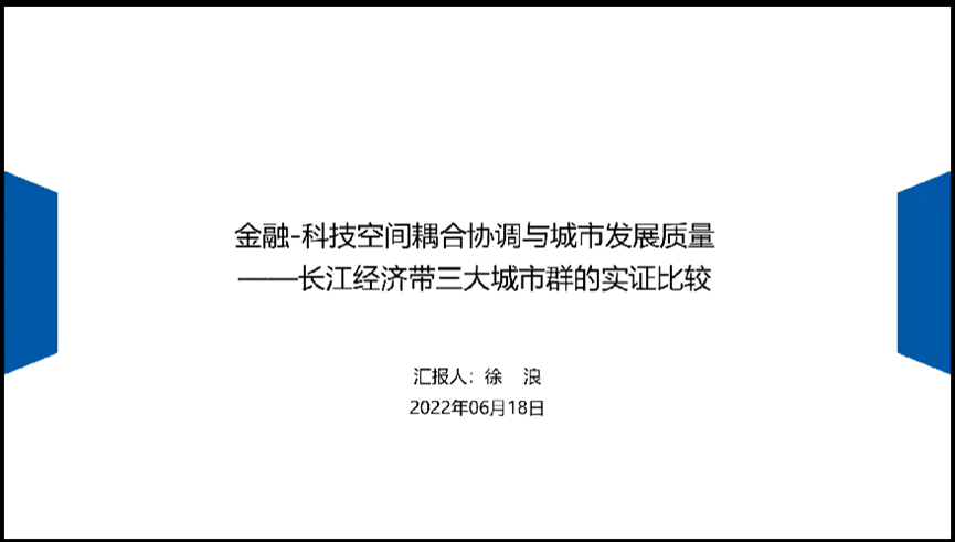 第四位报告人是来自重庆工商大学的徐浪,他的论文题目是《金融-科技空间耦合协调与城市发展质量:长江经济带三大城市群的实证比较》。长江经济带是重大国家战略发展区域,金融与科技是推动城市发展的最活跃要素,城市群则是城市发展的新型空间载体。现有研究多关注金融和科技要素的空间集聚,而忽略了两者空间互动对城市发展质量的影响;多聚焦单一省份或城市的考察,而忽视了流域内不同城市群之间的横向比较和结构剖析。基于长三角、长江中游和成渝三个典型城市群地级市的数据样本,通过指标体系构建、耦合协调度测算、多维度空间计量诊断,系统梳理了城市群视角下的金融-科技空间耦合之于城市发展质量的具体影响。这篇论文研究结论:(1)长江经济带的金融-科技集聚更多呈现为低水平空间耦合,且存在明显梯度演进格局;(2)不同城市群内部地级市之间在金融-科技集聚与发展质量指标上均呈现日益增强的空间自相关性,但也呈现明显空间异质性和路径依赖;(3)金融-科技耦合协调对城市发展质量存在显著正向驱动,但也存在空间维度的“虹吸效应”和地域维度的“梯度效应”。基于前述研究,这篇论文认为虹吸效应,既要从外部解决,也要从每个城市群内部相互解决。