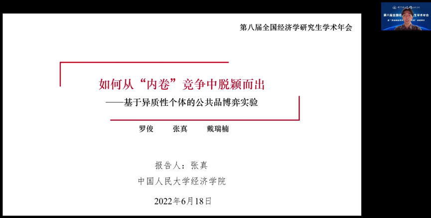 第一位报告人是来自中国人民大学的张真,他的论文题目是《如何从“内卷”竞争中脱颖而出——基于异质性个体的公共品博弈实验》。这是一篇实验经济学的论文,张真重点介绍了实验设计,在实验室环境中以公共品博弈为框架,结合个体异质性考察了竞争环境下个体的策略选择,使用机器学习的聚类法和已有研究中的划分法识别了个体具有的合作特质,探究了基于公共品博弈的竞争机制是否能筛选出合作的个体及合作的策略。研究结论和讨论内容如下:(1)提出了一个非对称的两步记忆策略表示法,并发现获胜者有明显的策略性合作行为;(2)通过两种合作特质识别法,发现合作者更可能从竞争中脱颖而出;(3)讨论“内卷”竞争是什么?对合作的影响既非像直觉中一样会抑制合作,也非像已有文献中一样显著促进合作行为,定义竞争的不只有竞争的(锦标赛)结构,还有竞争标准。