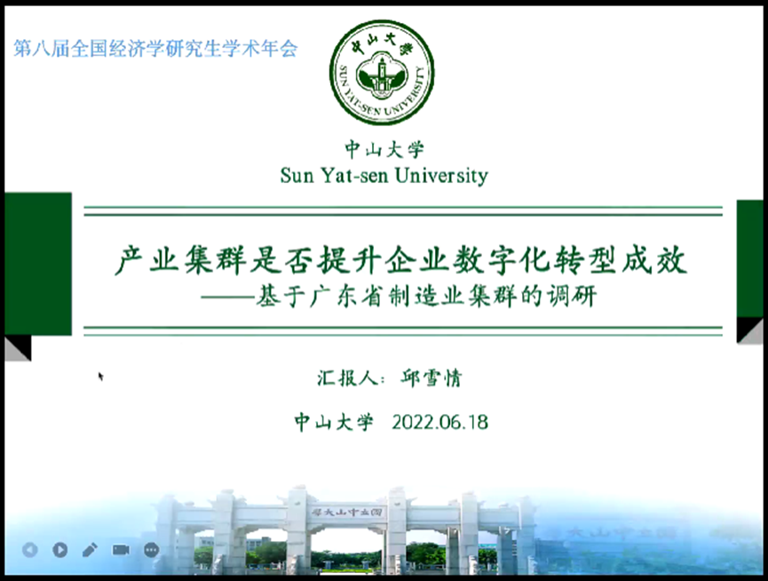 第五位报告人是来自中山大学的邱雪情,她的论文题目是《产业集群是否提升企业数字化转型成效——来源于广东省制造业调研问卷的证据》。这篇论文聚焦于产业集群能否促进企业数字化转型,并提升企业数字化转型效能。这篇论文的创新点有二,一是利用2021年课题组开展“广东省加快产业集群数字化转型,推进先进制造业高质量发展”专题调研问卷收集的一手数据;二是探讨产业集群如何影响企业数字化转型,填补了文献空缺。实证部分的基准回归结果显示:产业集群显著促进集群内企业进行数字化转型,且转型成效更加突出;集群内企业主攻生产制造缓解更加有利于提高转型成效。异质性检验从企业产业链供应链特征、企业规模与所有制特征和企业技术特征三个方面展开,发现产业集群能够提升经济落后地区产业链供应链稳定性薄弱企业的数字化转型,中小企业和民营企业的转型成效,现代制造业、自主研发企业以及专精特新企业的数字化转型成效。这篇论文的稳健性分析也验证了主要结论的可靠性。三个方面的研究结论也为推动制造业数字化转型提供了重要启示,以及从产业集群数字化转型视角探寻提升产业链供应链稳定性的有效途径。