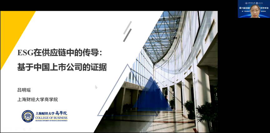 第五位报告人是来自上海财经大学的吕明瑶,她的论文题目是《ESG在供应链中的传导:基于中国上市公司的证据》。企业的环境、社会和公司治理(简称ESG)表现近年来受到社会的广泛关注,而供应链上下游企业、供应链上下游企业的影响也是备受关注的话题。本文从供应链的角度切入,采用了全球供应链数据库FactSet 2011到2020年的供应商-客户关系对数据,实证分析了中国沪深A股上市公司客户对其供应商业绩表现的影响。研究发现客户企业良好的ESG表现会通过供应链传导至上游供应商,从而使供应商企业的ESG评分提高。进一步检验表明,ESG的传导具有单向性并当供应商处于ESG整体表现较差的行业时,这一效应更显著。研究还发现,供应商企业的对外直接投资和客户企业董事的海外经验在这一传导过程中至关重要。文章为进一步推进中国企业承担环境和社会责任、加强供应链合作,从而实现可持续发展目标提供了重要的经验证据。