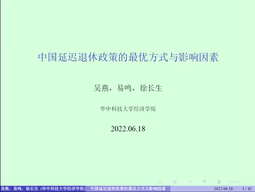 第二位作报告的研究生是来自3044永利集团官网的吴燕。她的论文题目是《中国退休政策的最优方式与影响因素》。由于中国由于寿命的延长和出生率下降,中国人口正在经历迅速的这个老龄化。在此背景下,我国社保系统面临巨大的压力。养老金改革成为必然趋势。由于政策的可执行性,财政投入的可持续性,福利的刚性等原因,导致延迟退休政策成为了这个政府的首选方案。本文界定了最优延迟退休决策的两个判断标准:一是减轻社会养老保险体系的财政负担、增加其可持续性,二是改善延迟退休者的福利状况。本文在两期世代交叠模型下探讨了两种延迟退休方式(内生式、外生式)的必要性和有效性问题,证明了延迟退休政策确实能减轻社保负担,增加社保可持续性,并同时增加人们的福利,且内生延迟退休方式是最优选择。主要结论有:(1)相对于正常退休,两种延迟退休政策均有效缓解了养老金的支付压力,增加了社保体系的可持续性,改善了延迟退休者的福利;且内生延迟退休效果最优,外生延迟退休其次,正常退休最差。(2)出生率、寿命以及劳动生产率增加对延迟退休政策下社保可持续性都有进一步增强的作用;寿命、劳动生产率增加对延迟退休政策下的福利效应也都起到了改善作用,而出生率增加则会削弱这一效果,即降低了正常退休与延迟退休之间的福利差距。(3)出生率、寿命以及劳动生产率中的二或三种因素同时增加对延迟退休下的社保可持续性改善有进一步叠加效应;劳动生产率、寿命同时增加对延迟退休政策下的福利效应改善有叠加增强作用,而同时考虑增加出生率影响时便会削弱这一效果。(4)若提高缴税率,社会保障体系的可持续性会增加,人们退休后领取的养老金也会增多,符合“多缴多得”的规律;同时,人们的福利却会逐渐降低。