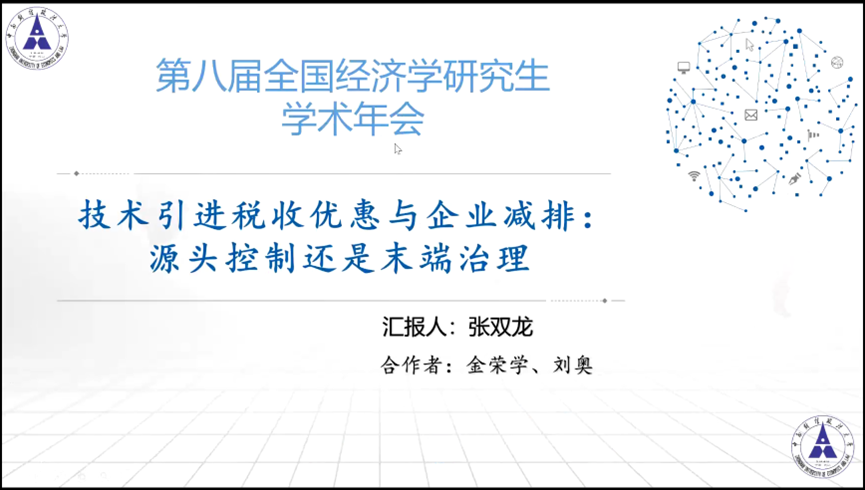 第四位报告人是来自的中南财经政法大学的张双龙,他的论文题目是《技术引进税收优惠与企业减排:源头控制还是末端治理》。污染防治攻坚战是我国全面建设小康社会的三大攻坚战之一,技术引进与税收优惠作为企业技术创新和生产效率提高的重要动力,对企业减排以及推动绿色低碳发展均有重要影响。本文基于技术引进税收优惠的视角,利用2006年商务部和国家税务局发布的《中国鼓励引进技术目录》作为一项准自然实验,通过构建双重差分模型考察技术引进税收优惠对企业污染排放的影响、作用机制以及异质性。实证结果表明:第一,技术引进税收优惠显著降低了企业污染排放,且时间动态效果呈倒“U型”型;第二,技术引进税收优惠通过驱动企业在污染产生源头控制和污染排放末端治理等两方面进行污染减排;第三,技术引进税收优惠对企业减排的效应在国有企业、东部地区以及重度污染行业更突出。