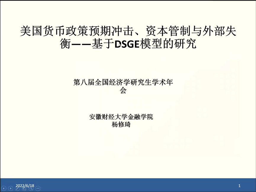 来自安徽财经大学的杨修琦首先报告了他的研究《美国货币政策预期冲击、资本管制与外部失衡——基于DSGE模型的研究》。本文构建了一个小国开放DSGE模型,通过引入外国利率预期冲击和未预期冲击刻画美国货币政策的预期冲击对于我国的影响。特别关注在不同资本管制程度下,我国实际汇率、对外净资产以及估值效应等外部变量的响应。结果表明,第一,以美国为代表的利率的负向冲击会带来国内消费和产出的上升,通货膨胀率下降,名义利率受国外利率影响也下降。外部变量方面,直接标价法下的实际汇率降低并且波动明显,对外净资产持续下降,并且带来了持续的负的估值效应。第二,考虑了美国货币政策预期冲击之后,变量的变化程度明显加大,预期冲击会带来经济的大幅波动,显示了美联储前瞻性指引会对我国经济产生显著的影响。第三,加强资本管制能够缓解外部失衡的程度,同时减少了经济的波动程度,但是削减了国内消费和产出的上升。第四,福利分析表明,货币政策预期冲击会使得经济波动增大,但能明显改善福利;资本管制会带来轻微的福利损失,但能明显改善外部失衡程度。该研究得出的建议是,第一,引导我国对美国货币政策的预期。第二,在逐步放松资本管制的过程中,要关注外部失衡的程度。第三,进一步推进利率和汇率的市场化进程,以应对双循环背景下的内外部均衡发展问题。