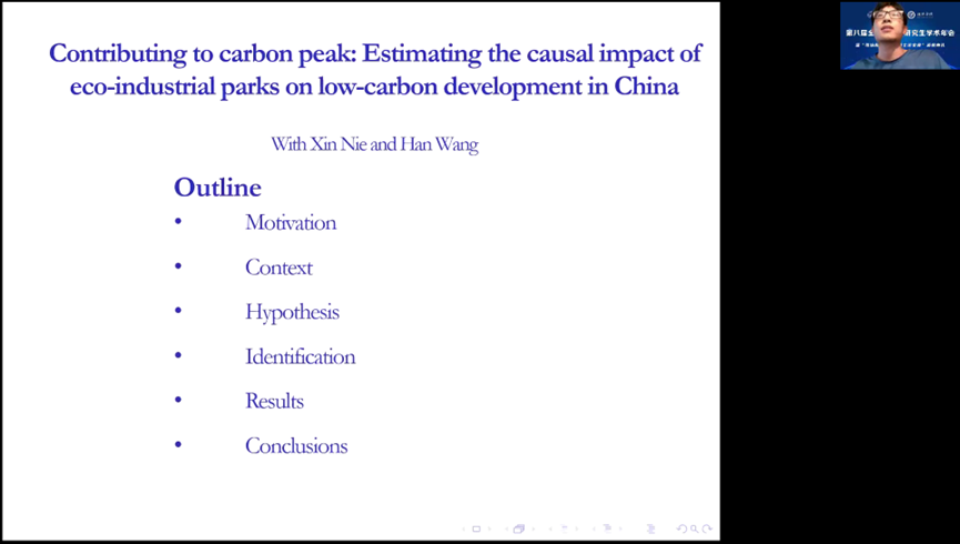 第三位报告人是来自的广西大学的吴健贤,他的论文题目是《Contributing to Carbon Peak: Estimating the Causal Impact of Eco-Industrial Parks on Low-Carbon Development in China》。低碳发展与生态工业园区(EIPs)相关,但是否存在因果关系尚不清楚。越来越多的有关环境工程研究的证据表明,生态工业园区可以减少碳排放,但很少有经济研究评估这种关系的因果关系、渠道和异质性。本研究采用交错双重差分(staggered DID)方法构建准自然实验,评估国家级生态工业园区对低碳发展的影响。实证结果表明,生态工业园区有助于中国实现低碳发展。具体而言,生态工业园区将试点城市的碳强度降低了7.2%。渠道分析表明,生态工业园区推进技术创新,激发波特效应,提升产业结构。区域异质性分析进一步表明,生态工业园区更有利于中国南方、沿海和胡焕庸线以东试点城市的低碳发展。进一步分析表明,生态工业园区压低了环境库兹涅茨曲线的峰值,有助于提前实现拐点。