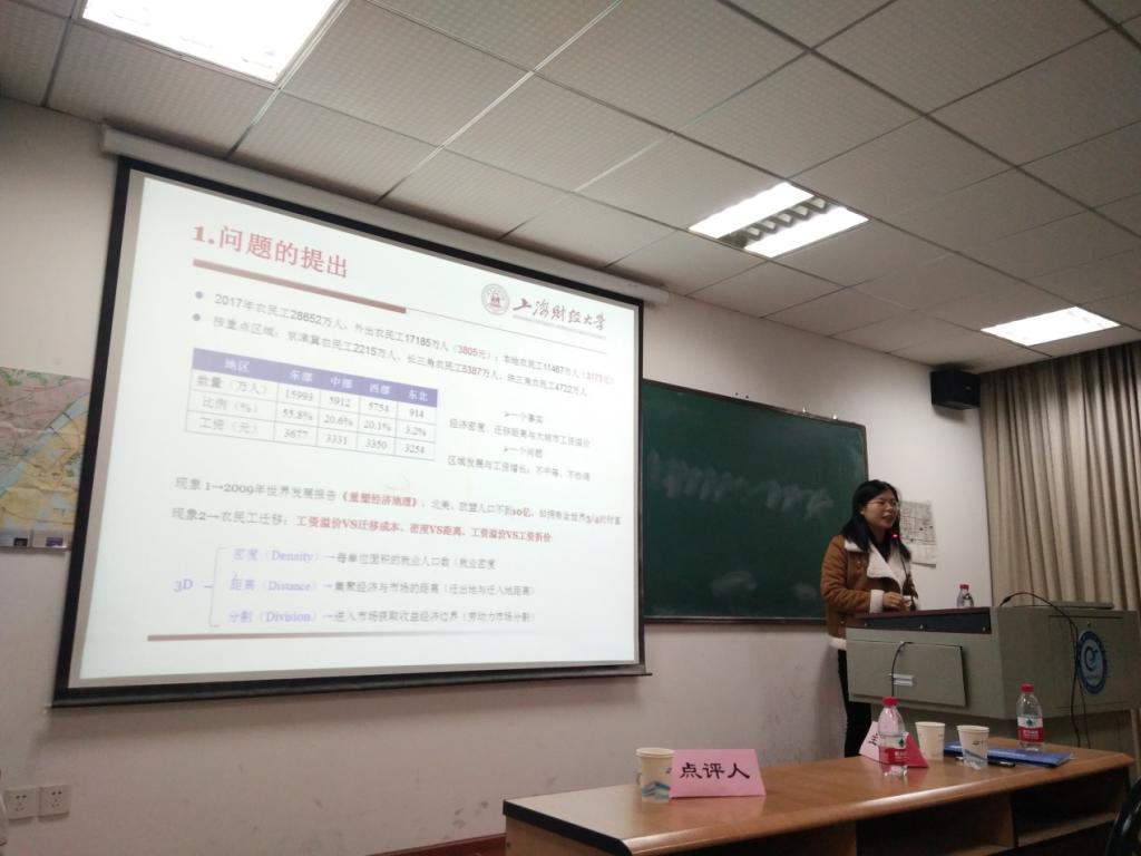 第三位报告者是上海财经大学的胡雯博士,她汇报的论文题目是《密度、距离与农民工工资:溢价还是折价》。胡博士介绍了本文回答的一个主要问题:大城市的密度、距离带来的是工资溢价还是工资折价。基于“成本——收益”约束构建农民工迁移的效用大化模型,从理论和实证检验了农民工迁入大城市工资溢价的存在性和异质性,并运用代理变量、工具变量克服了内生性和选择偏差,研究表明:(1)仅考察个体特征时,农民工迁移到密度高、距离远的大城市,工资溢价水平更高;(2)扣除城市就业的迁移成本,经济密度带来的溢价因远距离迁移太高的生活成本所抵消;(3)农民工的异质性会放大嵌入城市的溢价、折价效应,密度和距离共同拉大农民工城市间的工资差距。