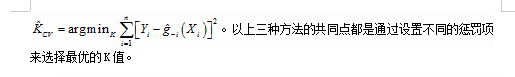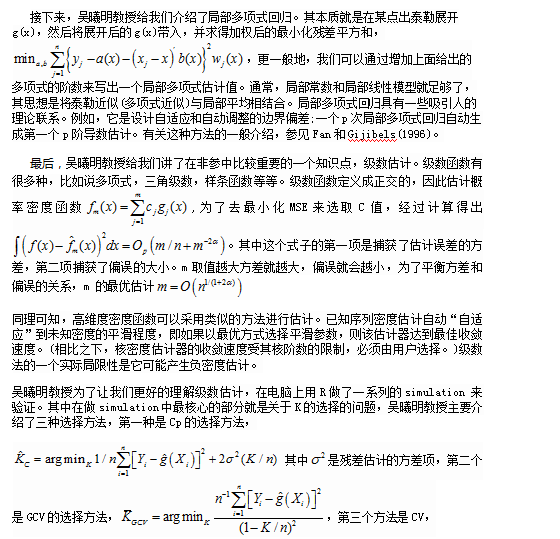 讲座伊始,吴曦明教授给我们介绍了在回归中如何使用核估计。在回归里,条件均值估计是用g(x)来表示的,g(x)是关于联合密度函数积分除以边际概率函数的结果,这样我们就可以运用之前讲述的相关知识给出结果。从直观上看,估计出来的g(x)就是关于Yi的一个加权平均,其中权重就是核估计的占比,从直觉角度上讲,离Yi越远的点就给与一个小的权重,离Yi值近的点就是给予一个大的权重。同时也给出了估计的g(x)的偏误和收敛速度。其MSE的阶数与之前将的类似。所以同样的这里也是涉及到窗宽的选择的问题。吴曦明教授按照之前的讲述模式,分别讲述了经验法则,平方交叉有效估计方法,AIC准则选取方法等。其中AIC估计方法是借用了参数估计的思想,引入残差方差项和惩罚项做权衡,最后得到了h的估计值。