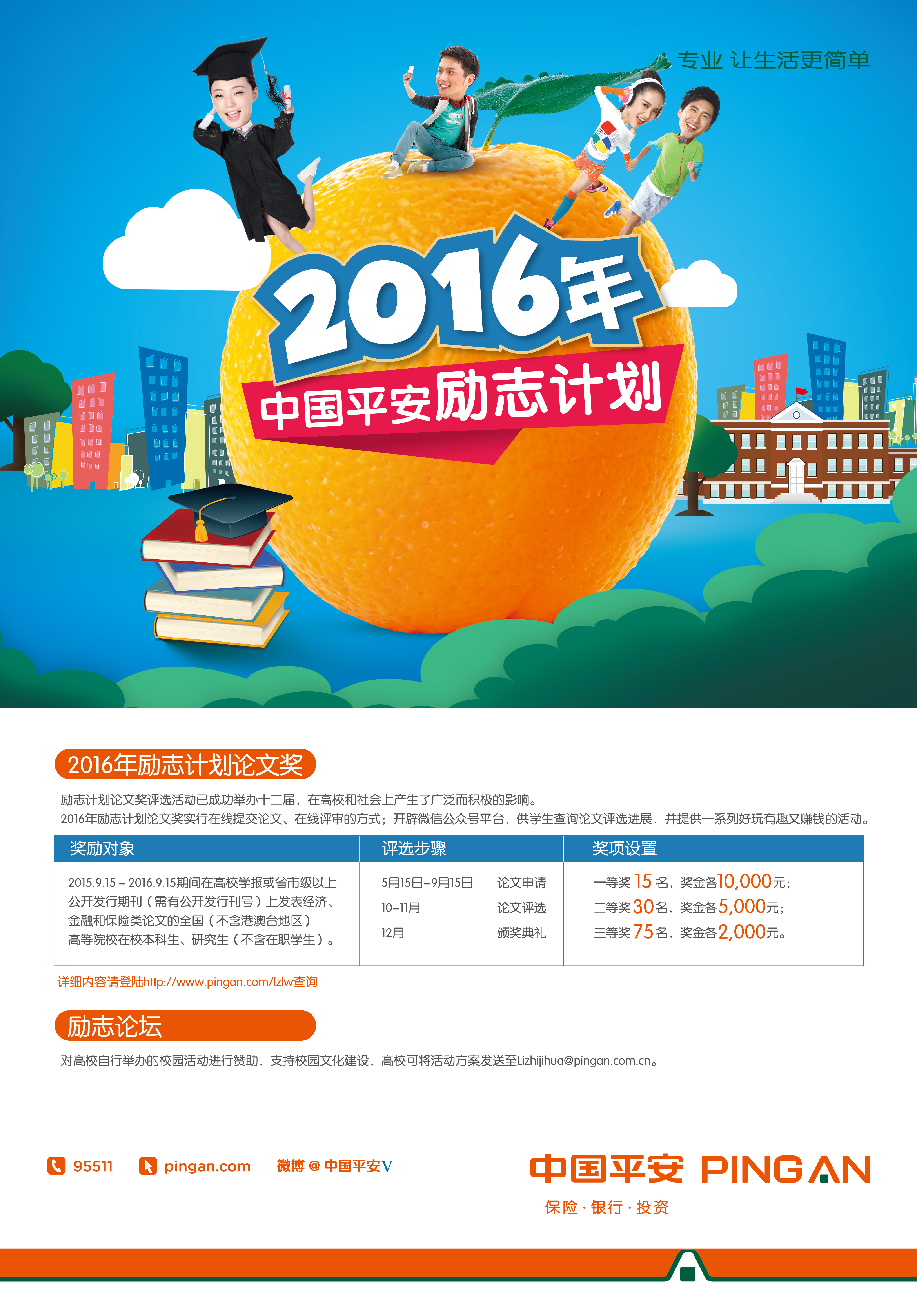 (3)2016年12月,将在2016年度中国平安励志计划年度颁奖典礼上,正式宣布论文奖名单,并为获奖代表颁奖。最终获奖者名单会在我公司官网及微信公众号“鲜橙部落”上正式公布,员工也可在微信号上自行查询。颁奖典礼后由合作单位中国青少年发展基金会直接向各高校发放奖金。